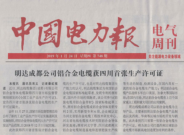 ¡¡¡¡2019Äê1ÔÂ24ÈÕ£¬¡¶ÖйúµçÁ¦±¨¡·µÚ8°æ¿¯µÇ¡¶KAIYUN³É¶¼¹«Ë¾ÂÁºÏ½ðµçÀ»ñËÄ´¨Ê¡Ê×ÕÅÉú²úÔÊÐíÖ¤¡·£¬È«ÎÄÈçÏ£º