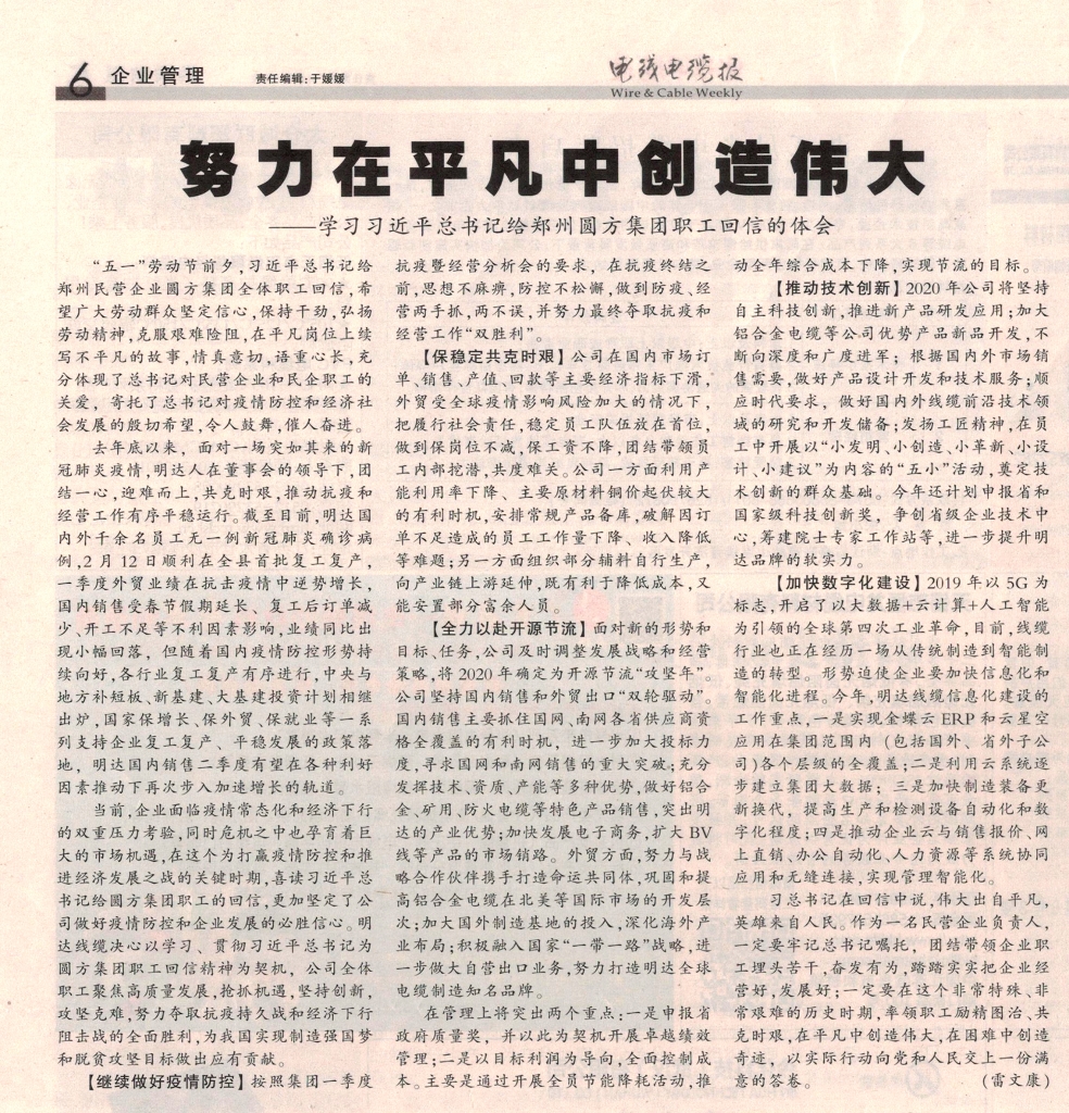 Ä¿½ñ£¬ÆóÒµÃæÁÙÒßÇ鳣̬»¯ºÍ¾¼ÃÏÂÐеÄË«ÖØÑ¹Á¦Ä¥Á·£¬Í¬Ê±Î£»úÖ®ÖÐÒ²ÔÐÓý×ÅÖØ´óµÄÊг¡»úÔµ£¬ÔÚÕâ¸öΪ´òÓ®ÒßÇé·À¿ØºÍÍÆ½ø¾¼ÃÉú³¤Ö®Õ½µÄÒªº¦Ê±ÆÚ£¬Ï²¶Áϰ½üƽ×ÜÊé¼Ç¸øÔ²·½¼¯ÍÅÖ°¹¤µÄ»ØÐÅ£¬¸ü¼Ó¼á¶¨ÁËÎÒ¹«Ë¾×öºÃÒßÇé·À¿ØºÍÆóÒµÉú³¤µÄ±ØÊ¤ÐÅÐÄ¡£ÎÒÃÇ¿ÌÒâÒÔѧϰ¡¢¹á³¹Ï°½üƽ×ÜÊé¼ÇΪԲ·½¼¯ÍÅÖ°¹¤»ØÐž«ÉñΪÆõ»ú£¬Ïòµ¼ÆóҵȫÌåÖ°¹¤¾Û½¹¸ßÖÊÁ¿Éú³¤£¬ÇÀ×¥»úÔµ£¬¼á³ÖÁ¢Ò죬¹¥¼á¿ËÄÑ£¬Æð¾¢ÕùÈ¡¿¹Òß³¤ÆÚÕ½ºÍ¾¼ÃÏÂÐÐ×è»÷Õ½µÄÖÜȫʤÀû£¬ÎªÎÒ¹úʵÏÖÖÆÔìÇ¿¹úÃÎÏëºÍÍÑÆ¶¹¥¼áÄ¿µÄ×ö³öÓ¦ÓÐТ˳¡£Ïêϸ½«Í»³ö×öºÃÒÔϼ¸ÏîÊÂÇ飺