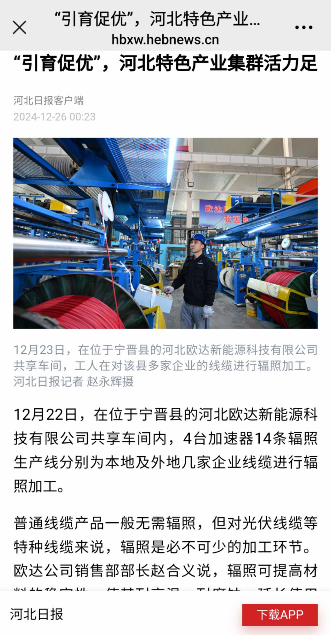 12ÔÂ22ÈÕ£¬ÔÚλÓÚÄþ½úÏØµÄºÓ±±Å·´ïÐÂÄÜÔ´¿Æ¼¼ÓÐÏÞ¹«Ë¾¹²Ïí³µ¼äÄÚ£¬4̨¼ÓËÙÆ÷14Ìõ·øÕÕÉú²úÏß»®·ÖΪÍâµØ¼°ÍâµØ¼¸¼ÒÆóÒµÏßÀ¾ÙÐзøÕÕ¼Ó¹¤¡£